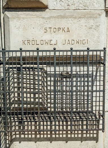 O co poprosiła męża królowa Jadwiga? Co przytrafiło się królowej podczas nadzorowania prac? W jaki sposób królowa pomogła kamieniarzowi? Co zrobił kamieniarz z odciśniętą stopą królowej?