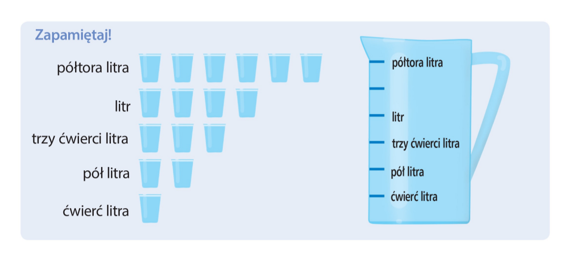 W jednym litrze mieszczą się 4 ćwierćlitrowe szklanki. Pomyślcie ile trzeba ich wlać, aby razem było 5 litrów płynu.